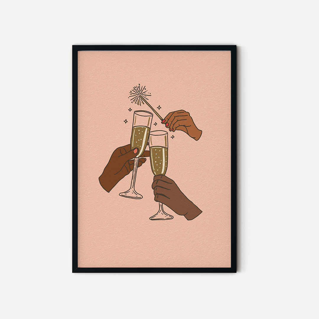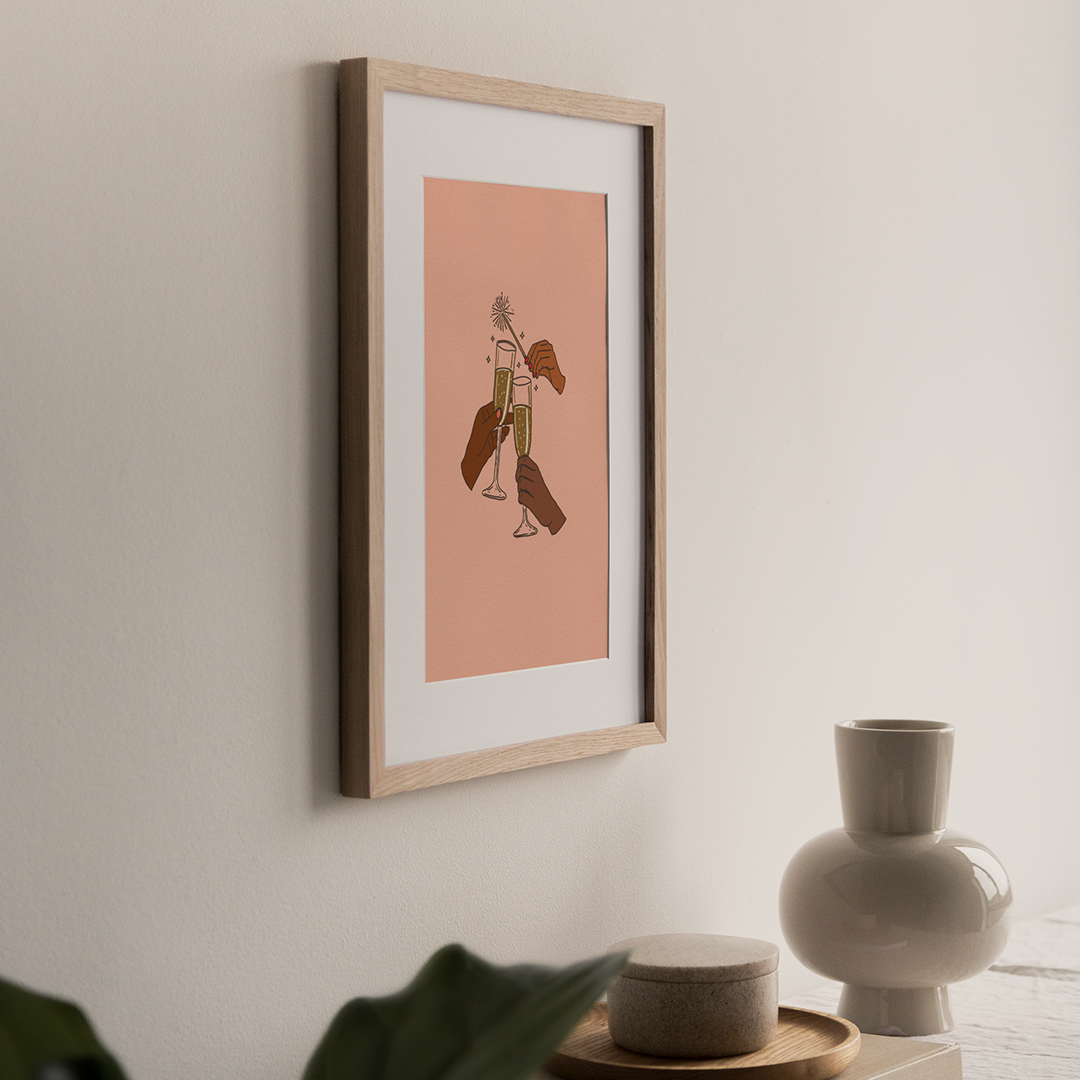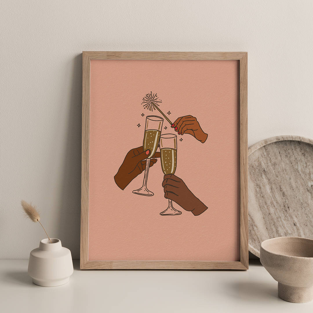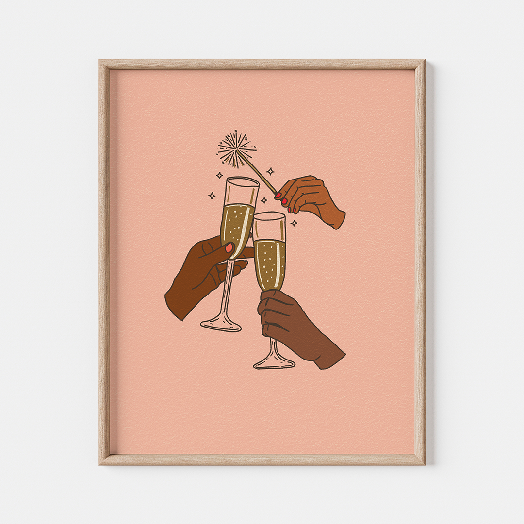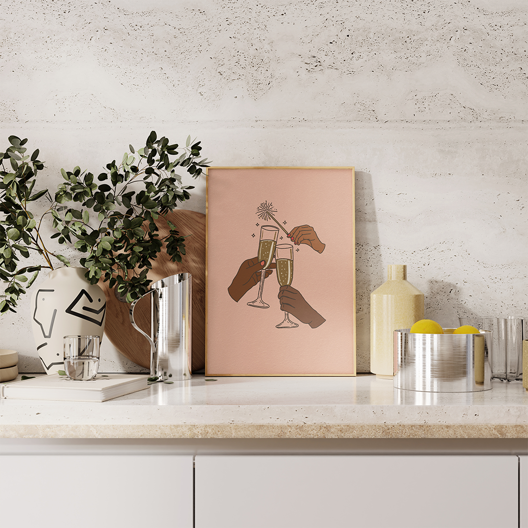 Add a celebratory touch to your space with this illustration of hands toasting with bubbly. This playful and modern design serves as a daily reminder to celebrate life’s wins, big or small. Perfect for your bar cart, kitchen counter, or gallery wall, this art piece will inspire you to raise a glass and toast to life’s little victories.
