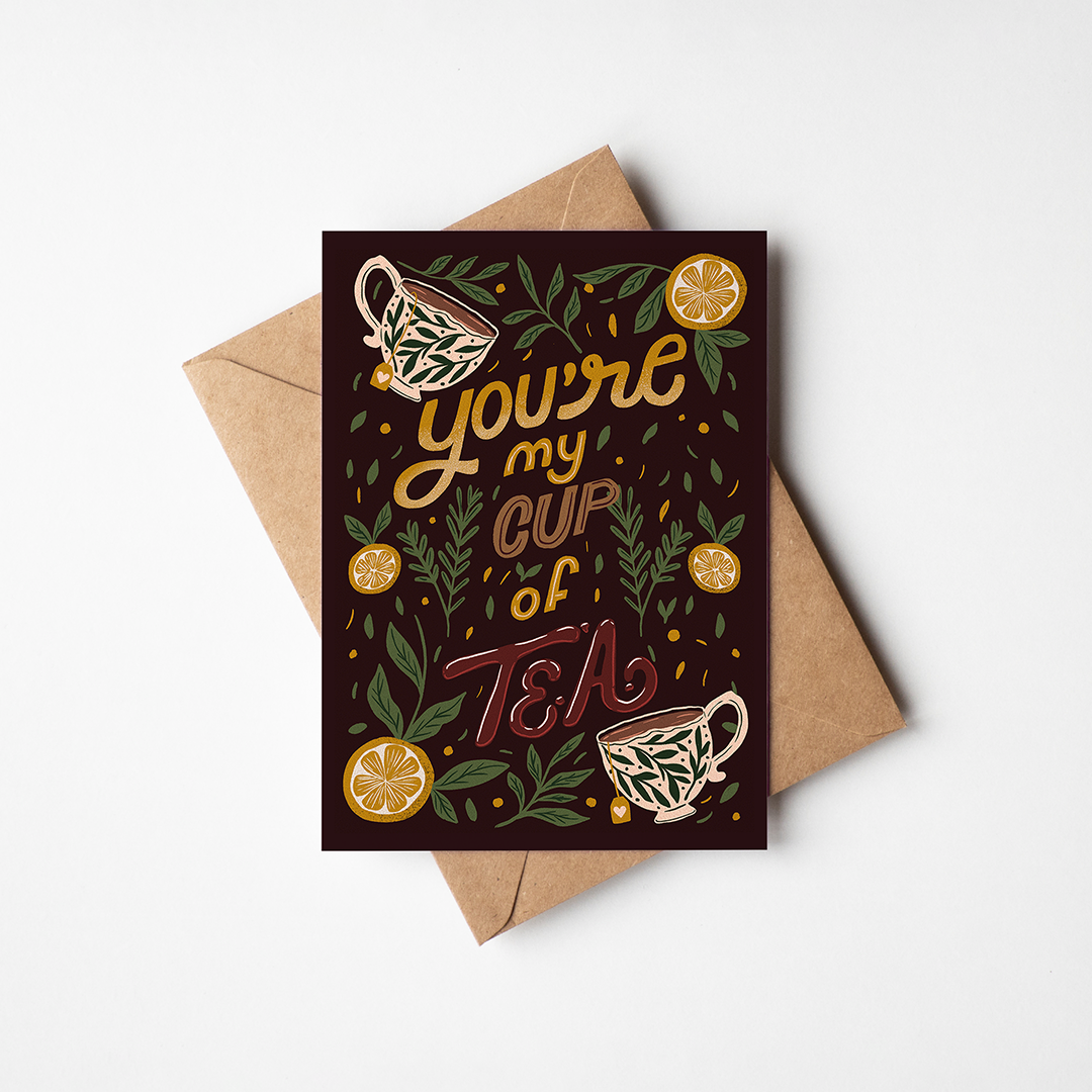 This charming greeting card features the phrase “You’re my cup of tea” with vibrant illustrations of tea cups, lemons, and leaves. In warm shades of brown, yellow, and green, it’s a cheerful and stylish way to spread some joy.